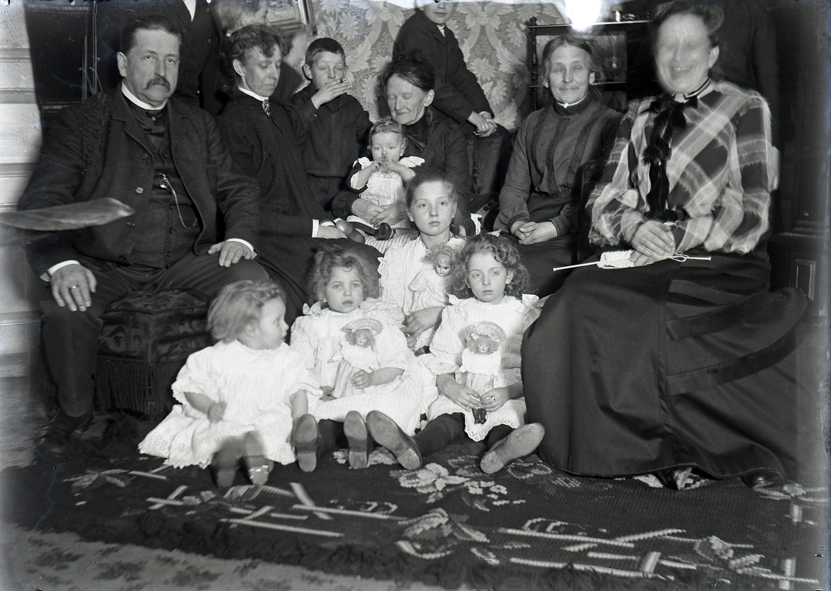 Grupporträtt av en familj som samlats i ett vardagsrum. I mitten sitter fyra vitklädda småflickor, varav tre med dockor i famnen.