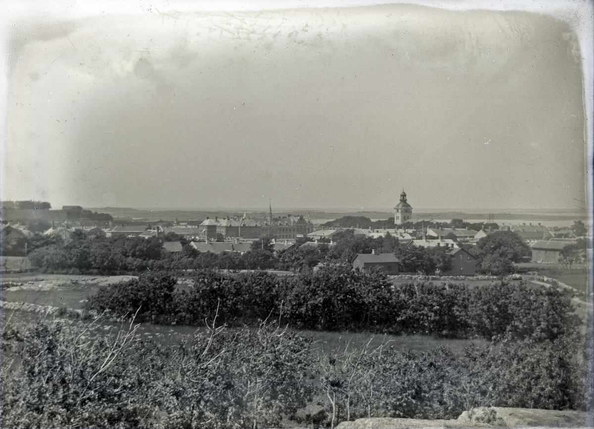 Vy över Varberg från ett berg i närheten. Man ser kyrkan och diverse hus. Fästningen skymtar till vänster.