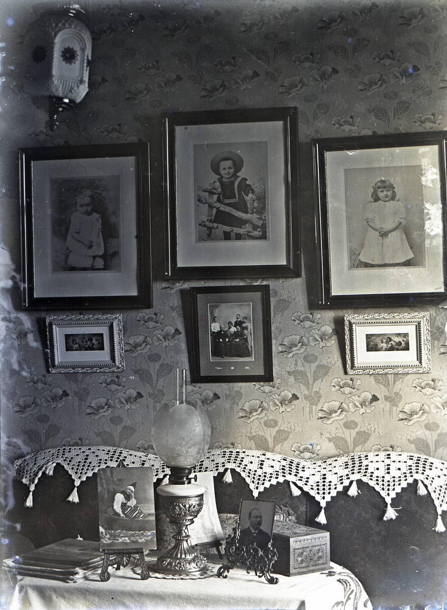 Interiörfoto från en salong. Man ser en soffa med antimakasser på ryggstödet, en finare fotogenlampa och en mängd tavlor (fotografier) på väggen.
