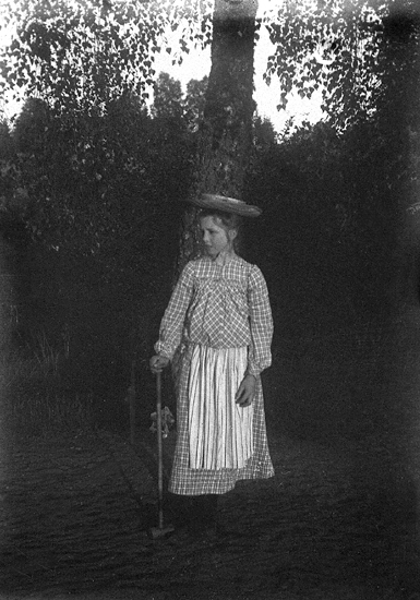 Foto av en flicka i rutig klänning, förkläde och stråhatt, som håller en krocketklubba i handen.