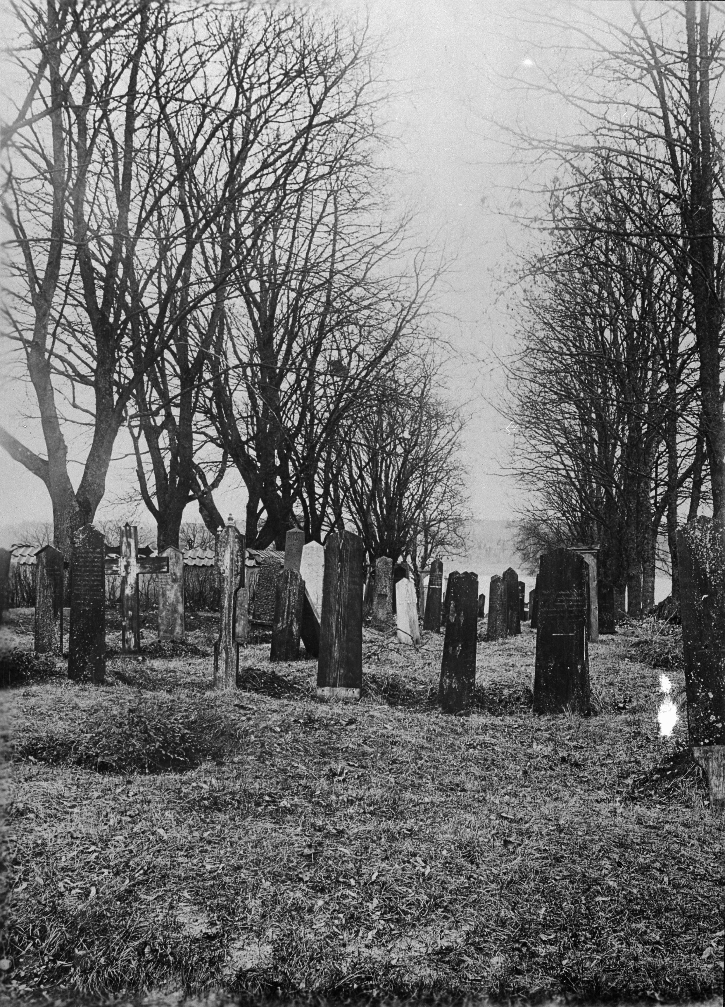 Kyrkogårdens norra del med en del gravvårdar av trä.