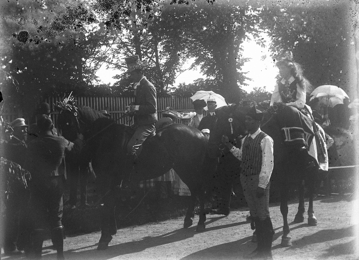 Foto av några utklädda ryttare (varav en kvinna i Värendsdräkt) .