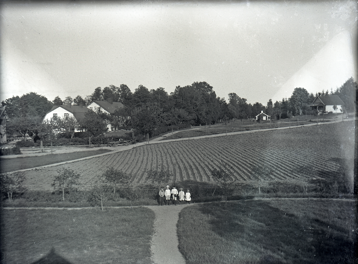 Foto uppifrån ett hus mot några barn, som står uppställda längs en trädgårdsgång i en trädgård.
