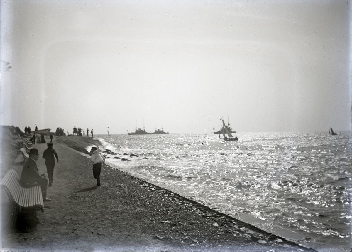 En solig bild från strandpromenaden i Varberg, med några krigsfartyg (jagare) i bakgrunden.