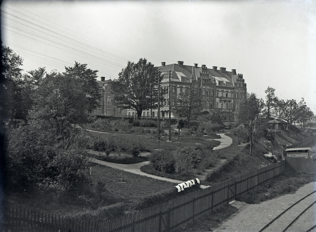 I förgrunden syns den stora trädgården till Vita villan, med tvätt utlagd att torka på häcken.