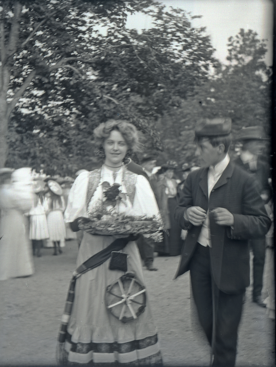 En ung kvinna, klädd i någon slags "zigenardräkt" bjuder runt något på ett fat. Till höger syns en intresserad ung herre.