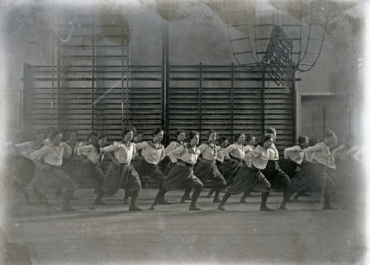 En grupp kvinnliga gymnaster i blus och s.k. ballongbyxor, har gymnastik i gymnastiksalen på dåv. Seminariet.