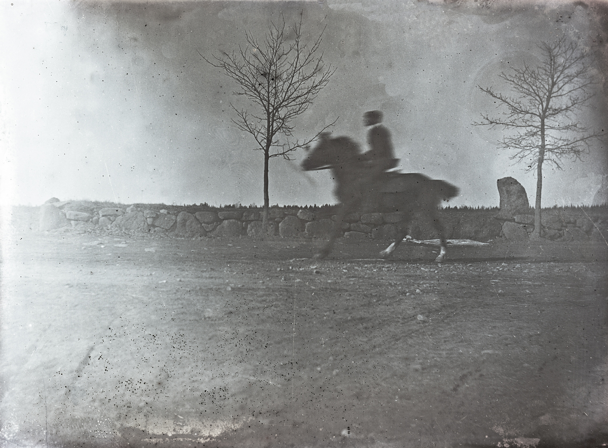 En ryttare till häst. I bakgrunden syns en stenmur.