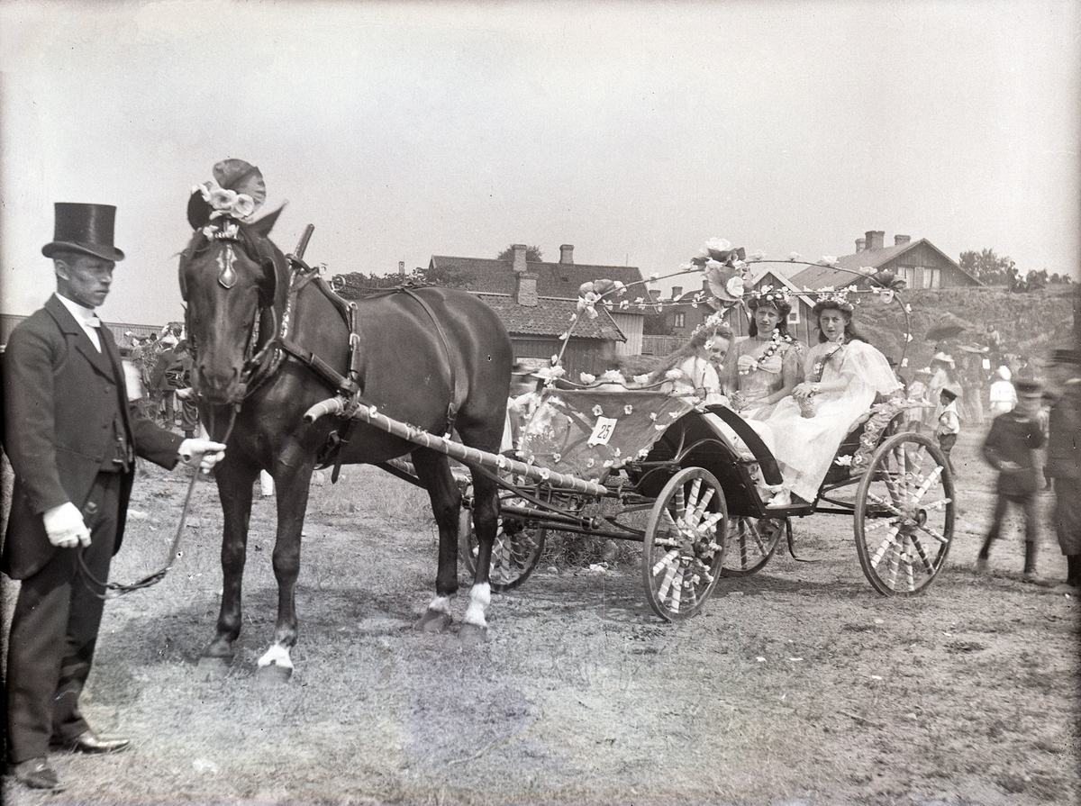 En vagn, dekorerad med pappersblommor. I vagnen sitter tre blomsterflickor.
