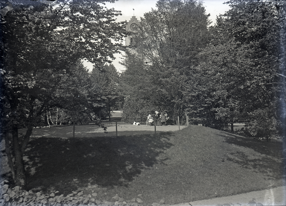 Linnéparken i Växjö. En familj har slagit sig ner på en liten kulle i parken,