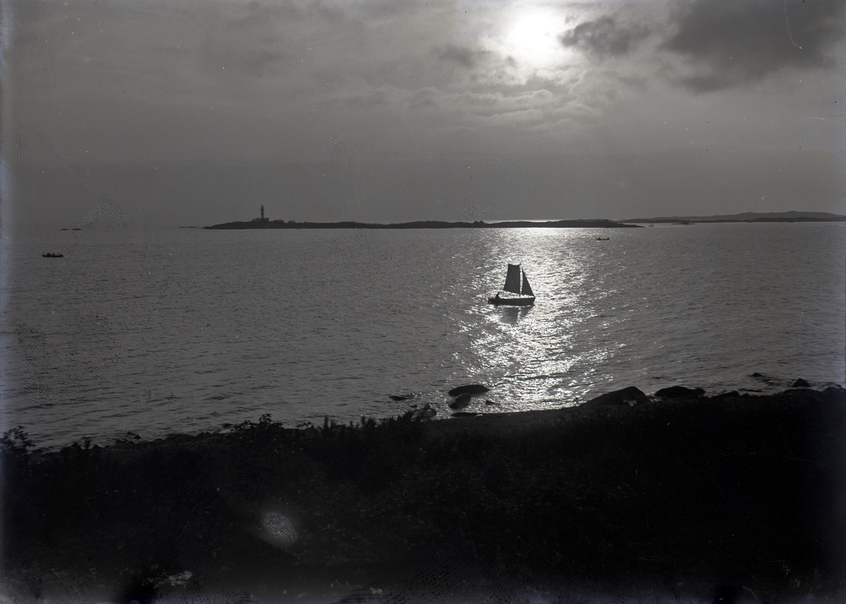 Landskap med hav och en segelbåt i motljus. I bakgrunden syns en fyr.
