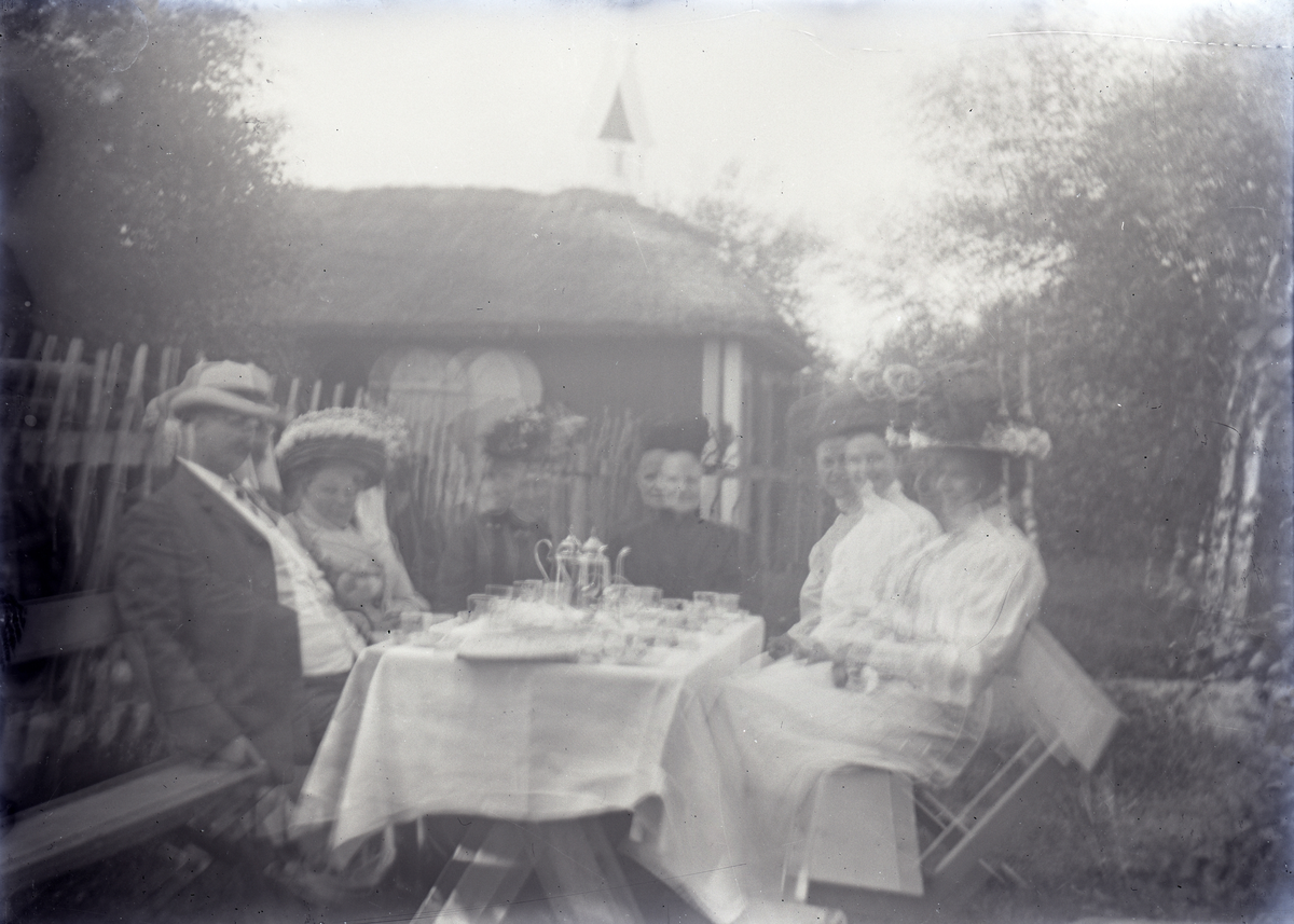 Ett sällskap har slagit sig ner kring ett kaffebord utomhus.