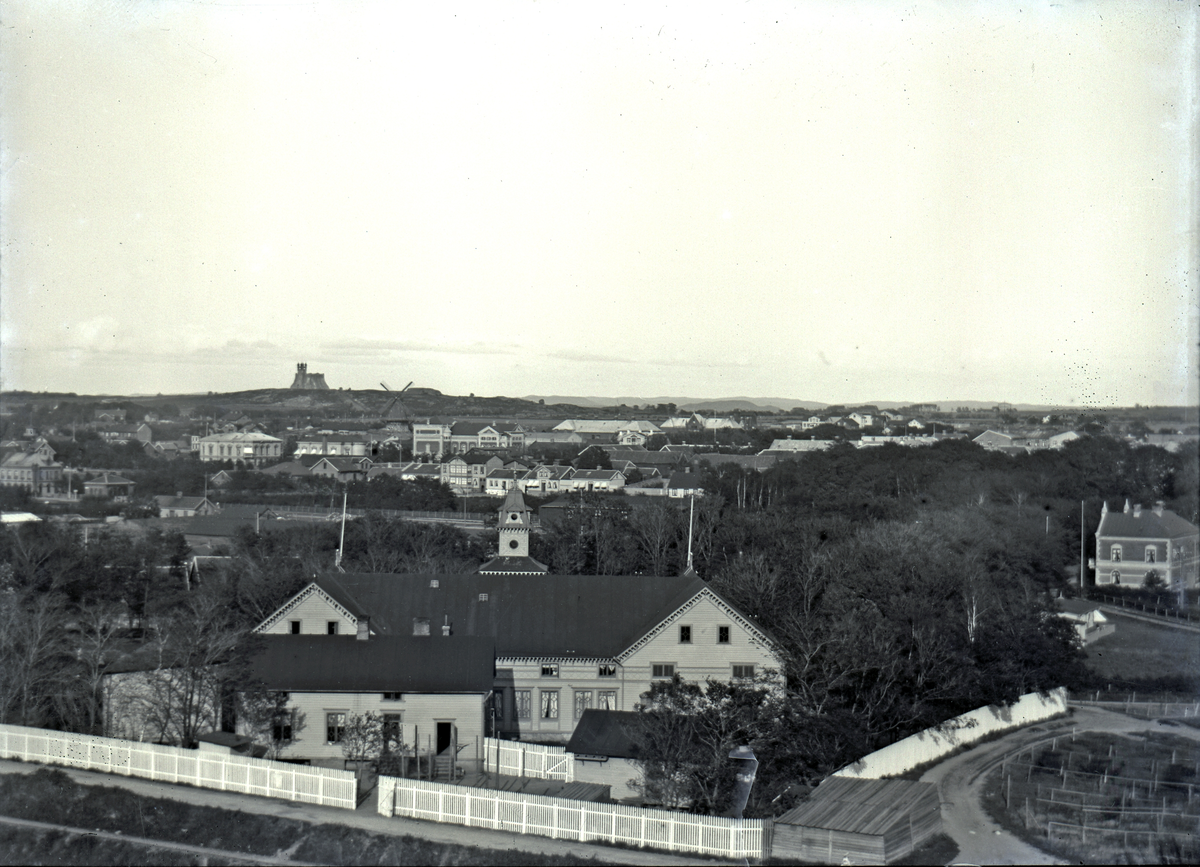Vy från fästningen mot Varberg. I förgrunden syns baksidan av Societetshuset m.m.