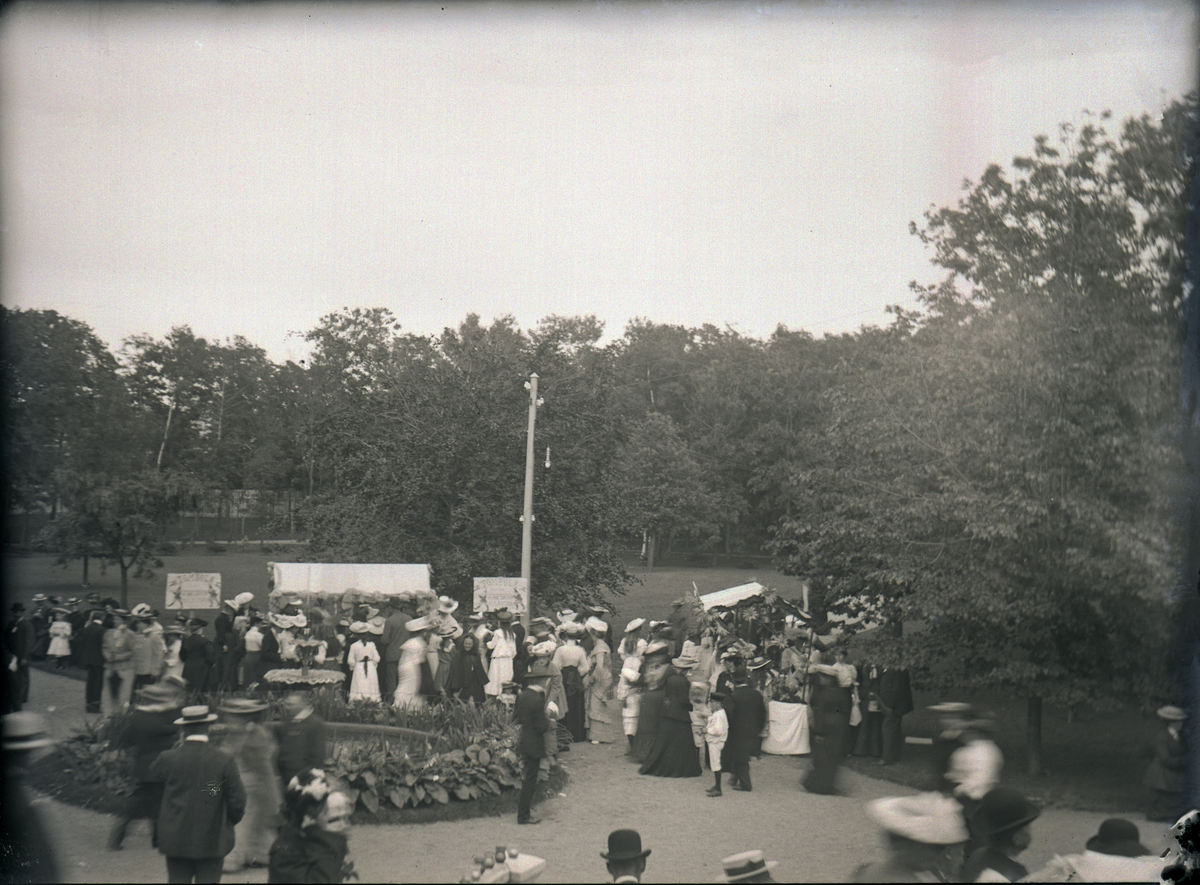 En mängd människor strosar runt i Societetsparken mellan olika slags marknadsstånd. Barnens Dag (?).
