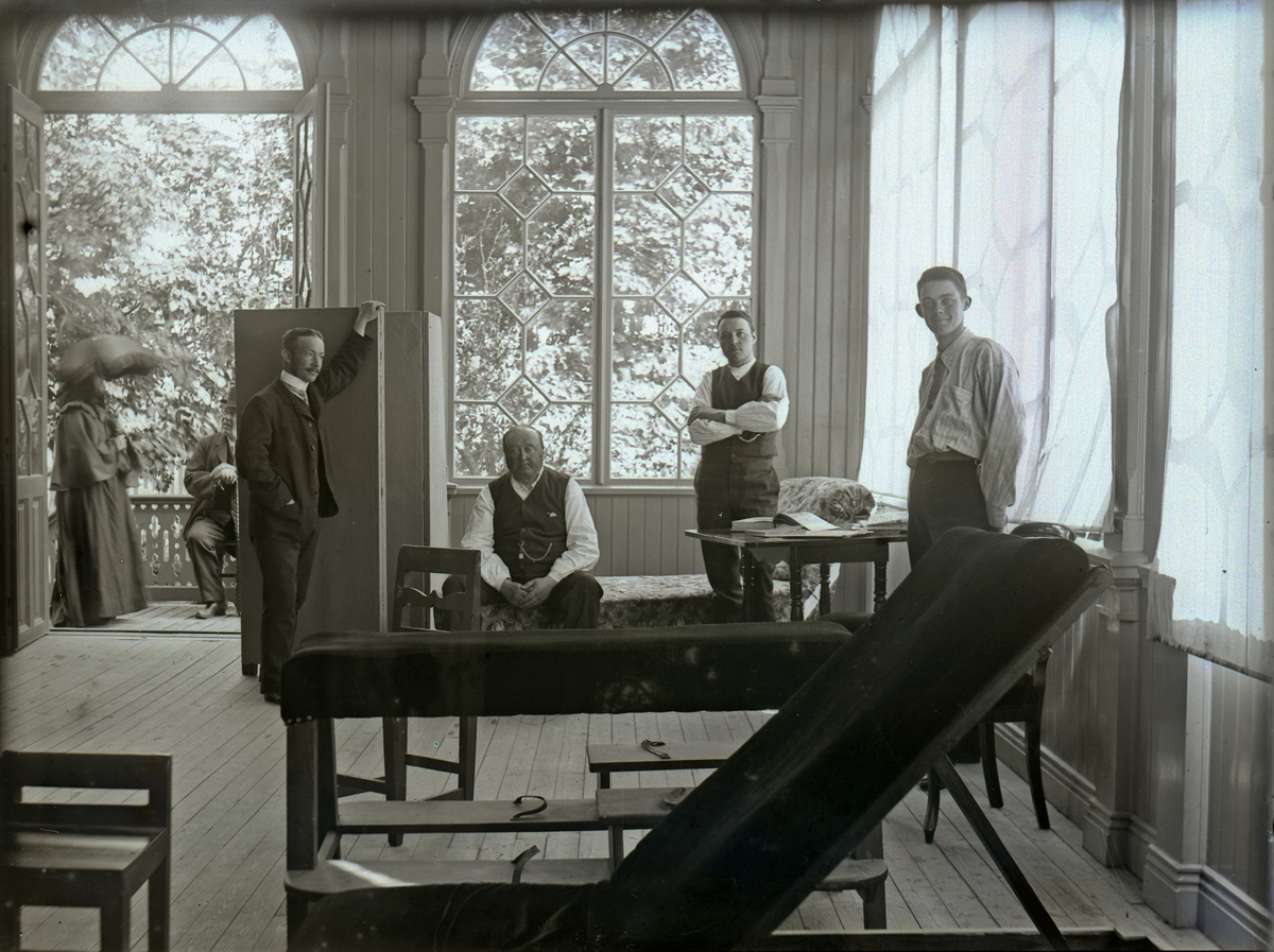 Foto av ett rum med diverse gymnastikredskap (bänkar m.m.) för sjukgymnastik och massering. I bakgrunden syns några herrar, varav en verkar vara "patient". På verandan i bakgrunden skymtar två äldre personer.