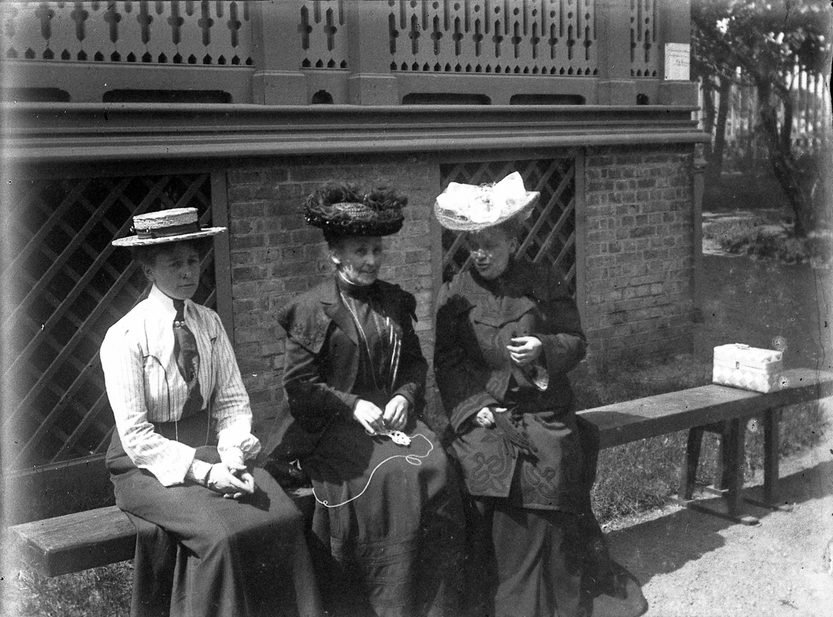Foto av tre kvinnor, varav två i mörka kläder, som sitter på en bänk nedanför Societetshuset (?). Den mittersta av dem har en virkning i knäet.