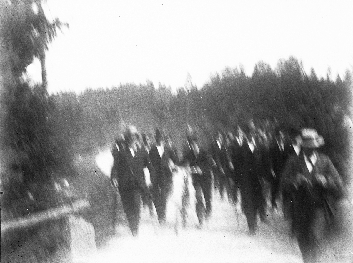 Foto av flera män som är ute på vandring längs en grusväg.