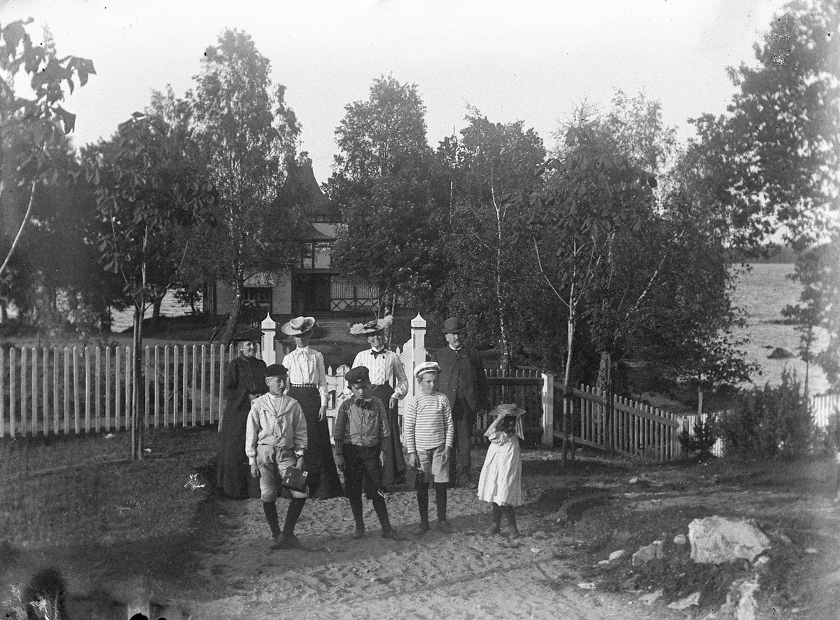 Foto av en familj (tre generationer) som samlats utanför staketet till sin sommarvilla, nära en sjö.