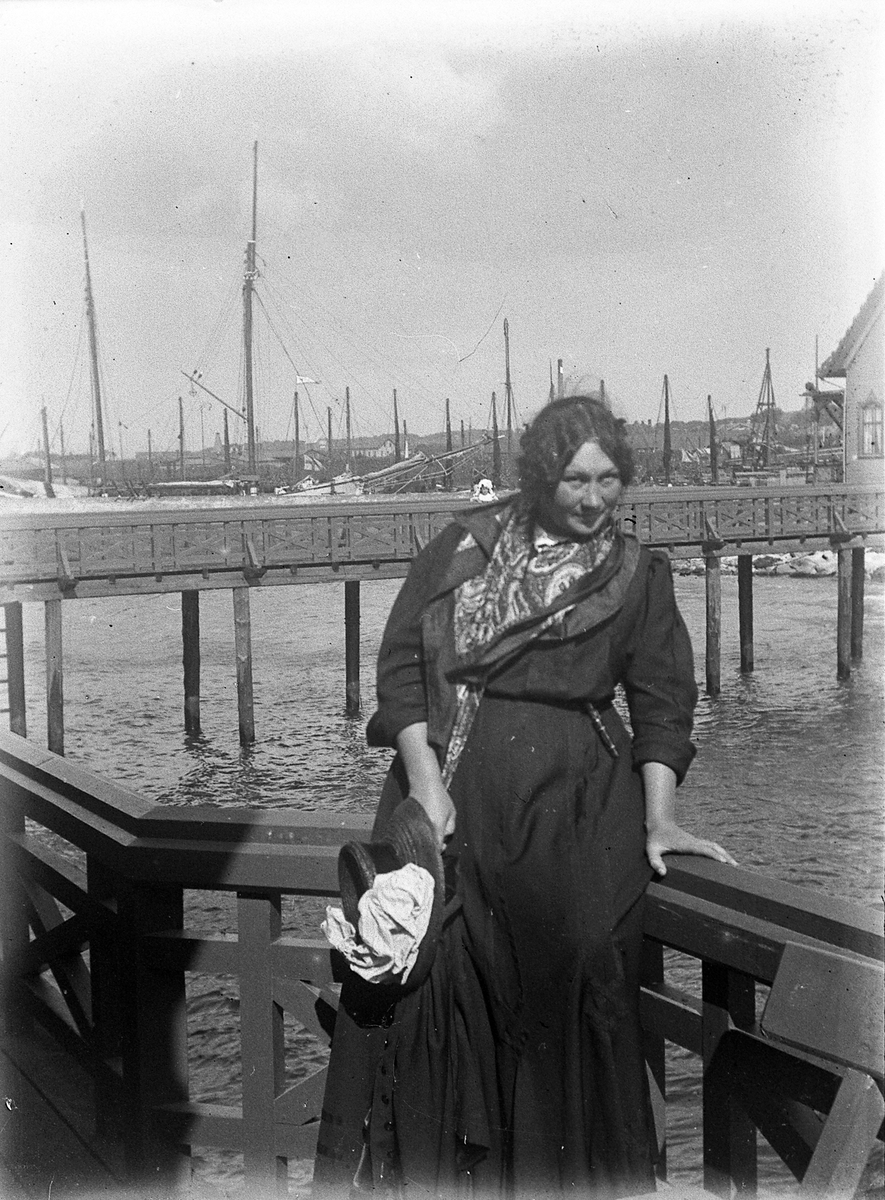 Foto av en ung kvinna, med hatten i handen, som står på bryggan utanför kallbadhuset i Varberg.