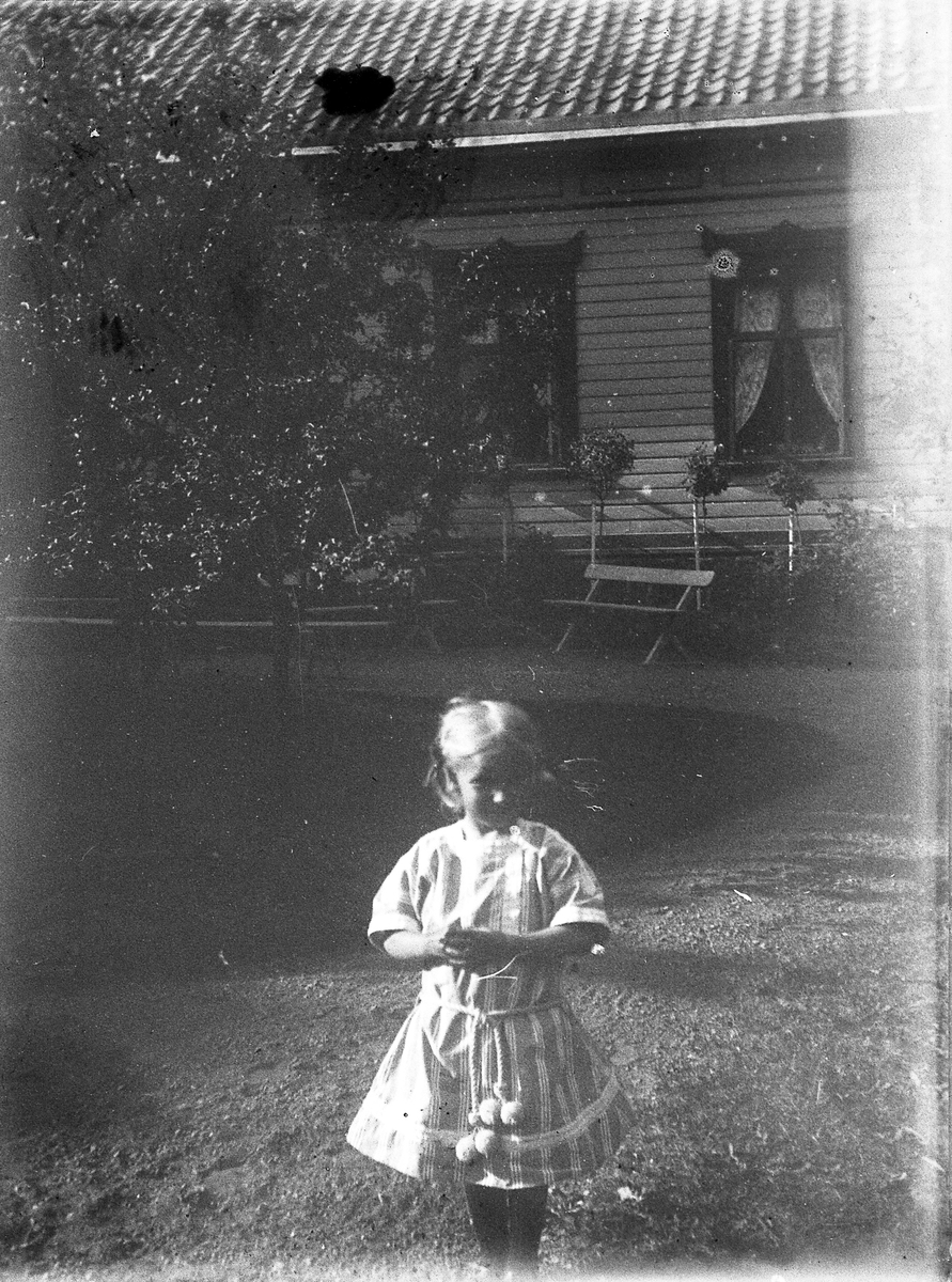 Porträtt av en liten flicka i en trädgård. I bakgrunden ser man