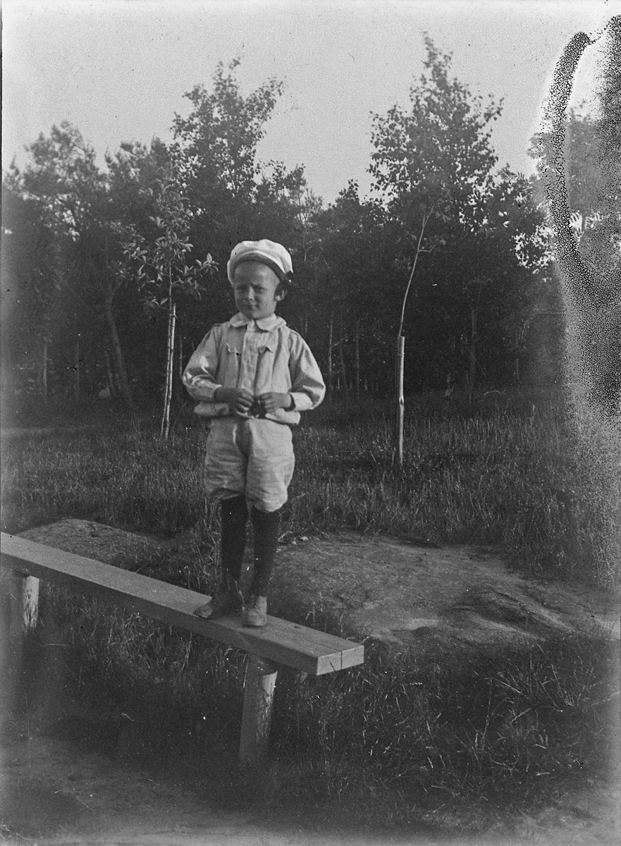 Foto av en pojke i knäbyxor m.m. På huvudet har han en rund, vit mössa. Han står på en trädgårdsbänk.
