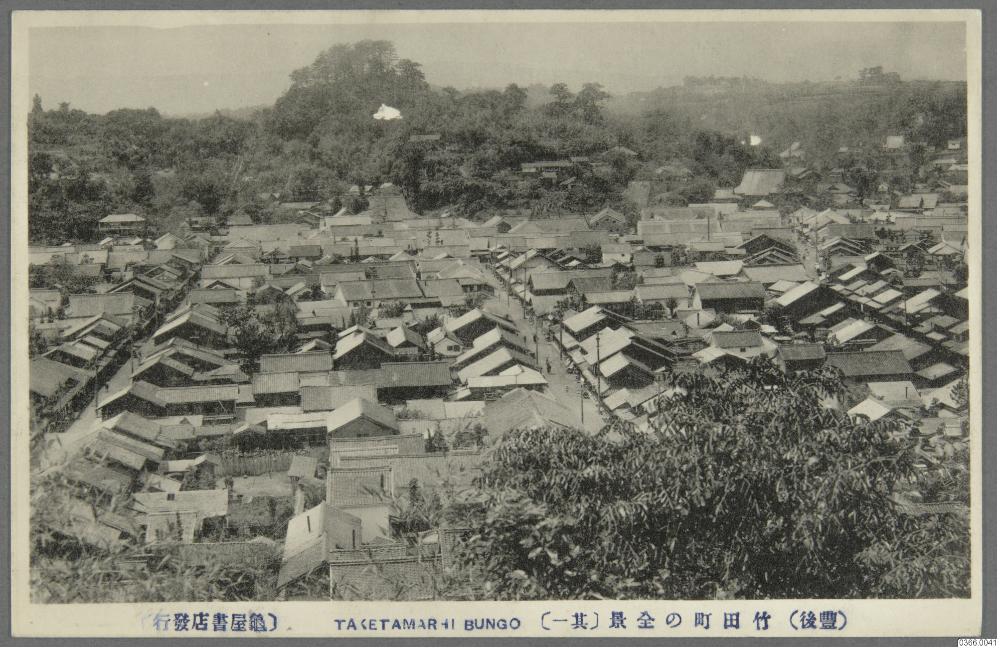 Vykort med motiv av stad ovanifrån, hustak, träd i för- och bakgrund. Text på framsida: "Text på annat språk, TAKETAMARHI BUNGO, Text på annat språk." Text på baksida: "CARTE POSTALE, Text på annat språk."