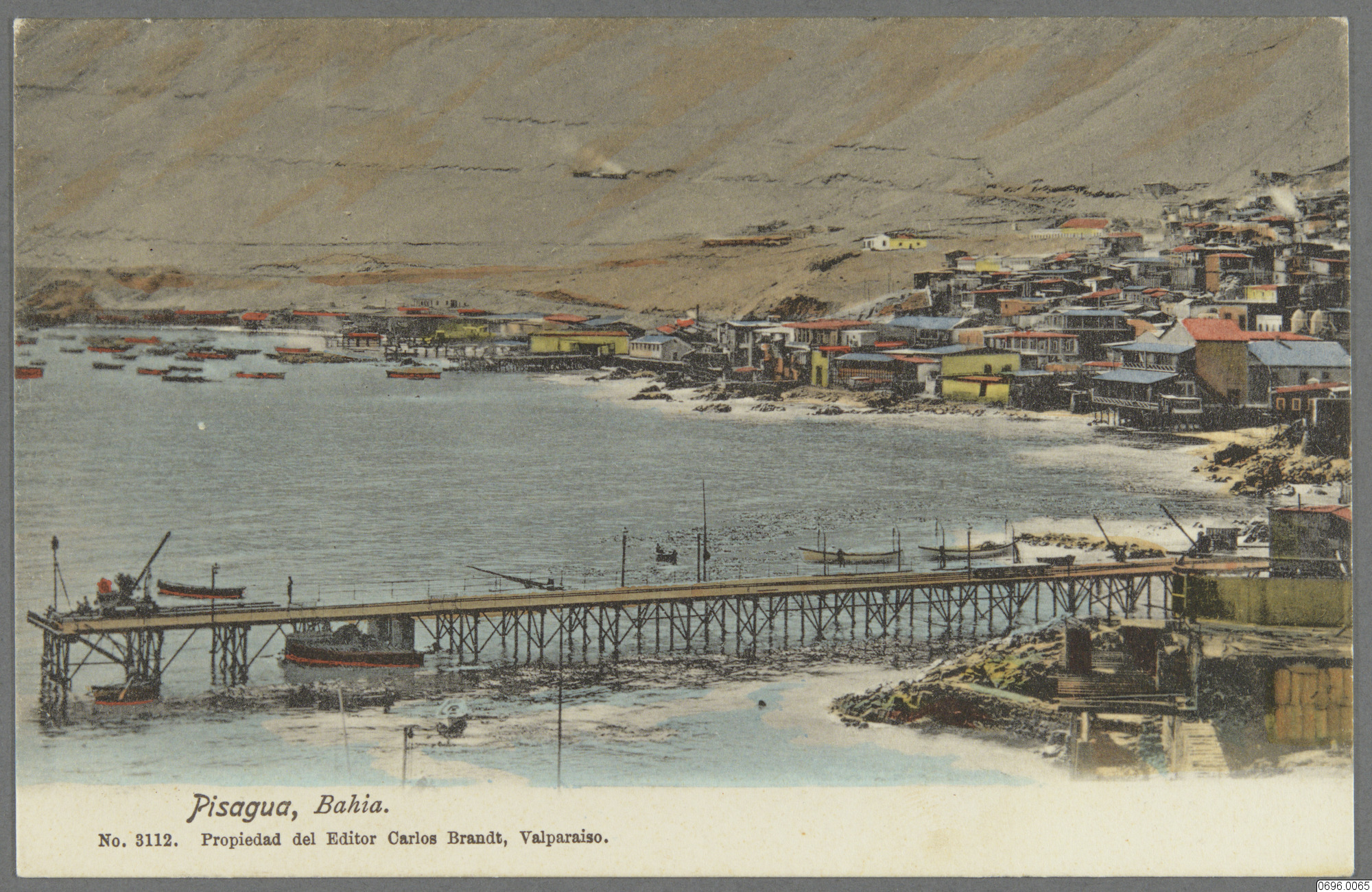 Vykort med kolorerad bild av pir vid hamnstad, båtar vid piren, berg i bakgrunden. Hamn med pir. Pisagua, Chile, Amerika. Text på framsida: "Pisagua, Bahia. No. 3112. Propiedad del Editor Carlos Brandt, Valparaiso." Text på baksida: "(Communicaciones) Tarjeta Postal (Solo para la Direccion)."
