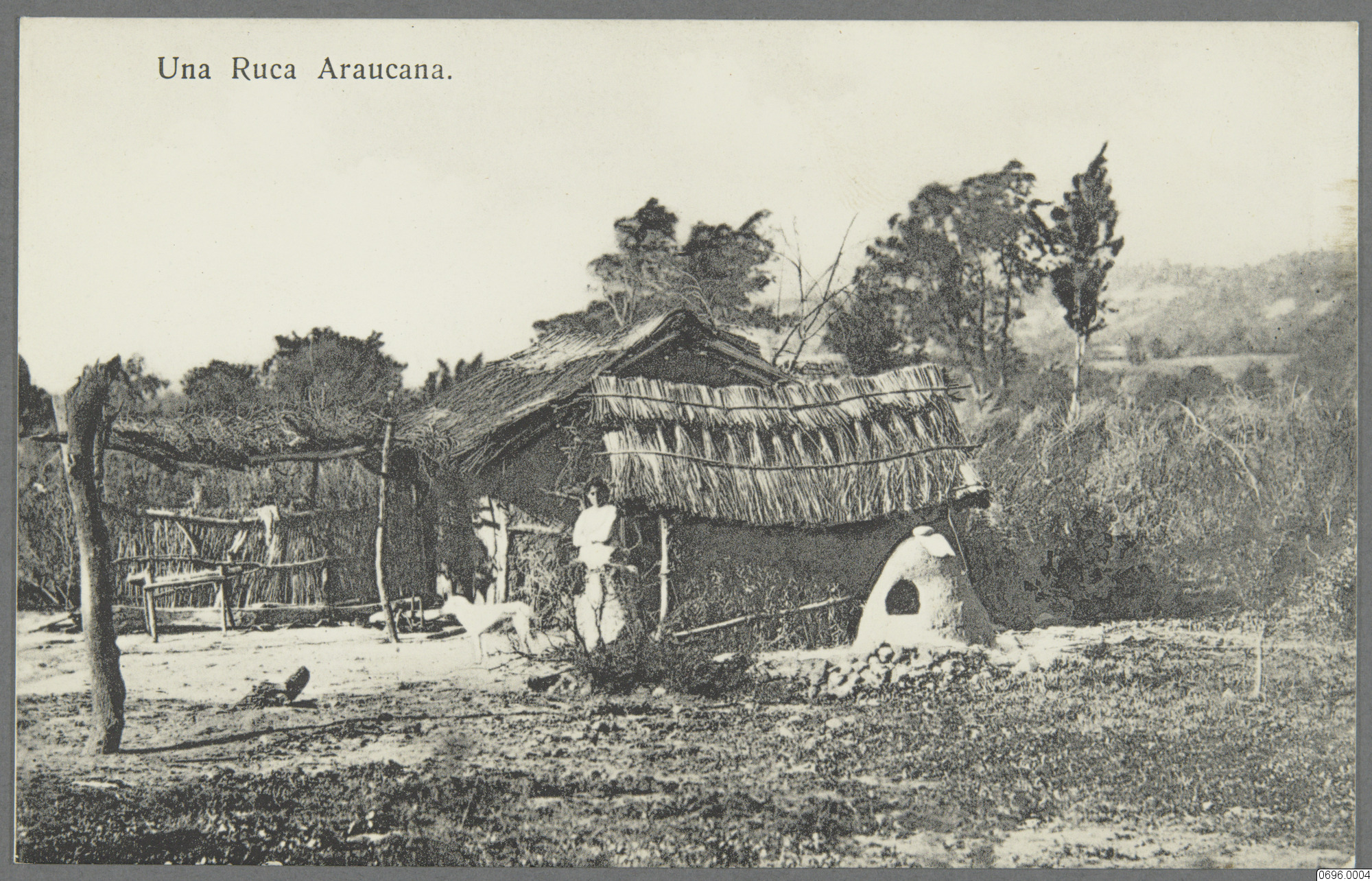 Vykort med motiv av kvinna samt hund framför hydda av trä och strå, lerugn till höger, öppen mark med växtlighet i förgrunden, träd och växtlighet i bakgrunden. Mapuchehydda i Sydamerika. Text på framsida: "Una Ruca Araucuna." Text på baksida: "(Comunicaciones) Tarjeta Postal (Solo para la Direccion) Propriedad de Hume y Ca, Ahumada 357."