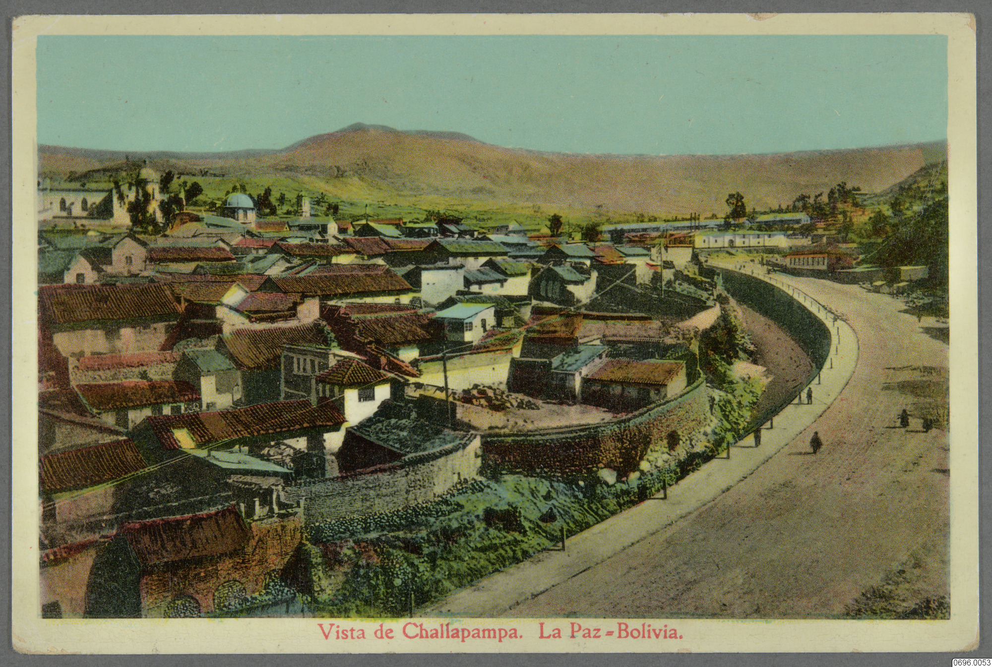 Vykort med kolorerad bild av utkanten av stad, väg följer stadens rand, människor gåendes på vägen, landskap med berg breder ut sig bakom staden. Challapampa; liten stad i Isla Del Sol. Bolivia, Amerika. Text på framsida: "Vista de Challapampa. La Paz = Bolivia." Text på baksida: "Tarjeta Postal, Arnó Hnos Editores. F7291 13."