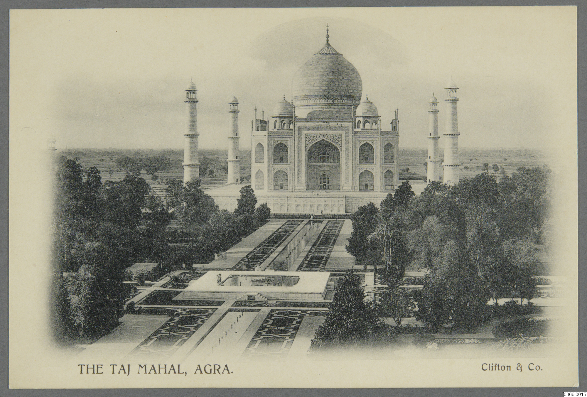 Vykort med motiv av ett magnifikt mausoleum med stora torn och en stor kupol; mogulhärskaren Shah Jahans favorithustru Mumtaz Mahals grav, ett välkänt historiskt landmärke, ansett som det finaste exemplaret av Mogulararkitektur. Agra, Uttar Pradesh, Indien.Text på framsida: "THE TAJ MAHAL, AGRA. Clifton & Co." Text på baksida: "UNIVERSAL POSTAL UNION - UNION POSTALE UNIVERSELLE, BRITISH INDIA, INDE BRITANNIQUE, POST CARD - CARTE POSTALE, THE ADDRESS ONLY TO BE WRITTEN ON THIS SIDE."