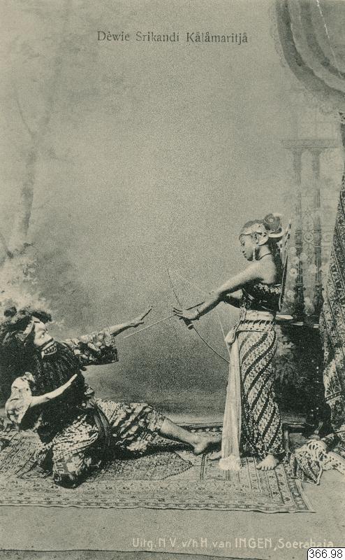 Vykort med motiv av man och kvinna i mönstrad ustryrsel, kvinnan med starkt markerade ögonbryn, stora örhängen, armband och utsmyckad huvudbonad och mannen med mask, kvinnan har pilbåge riktad mot mannen som värjer sig på marken, målad textil med pelare och grönska till bakgrund. Gudinnan Srikandi och en man med mask; från föreställning i Surabaya, Java, Indonesien. Text på framsida: "Déwie Srikandi Kålåmaritjå, Uit.N. V. v/hH. Van INGEN, Soerabaja." Text på baksida: "naam, adres, 11 21071."