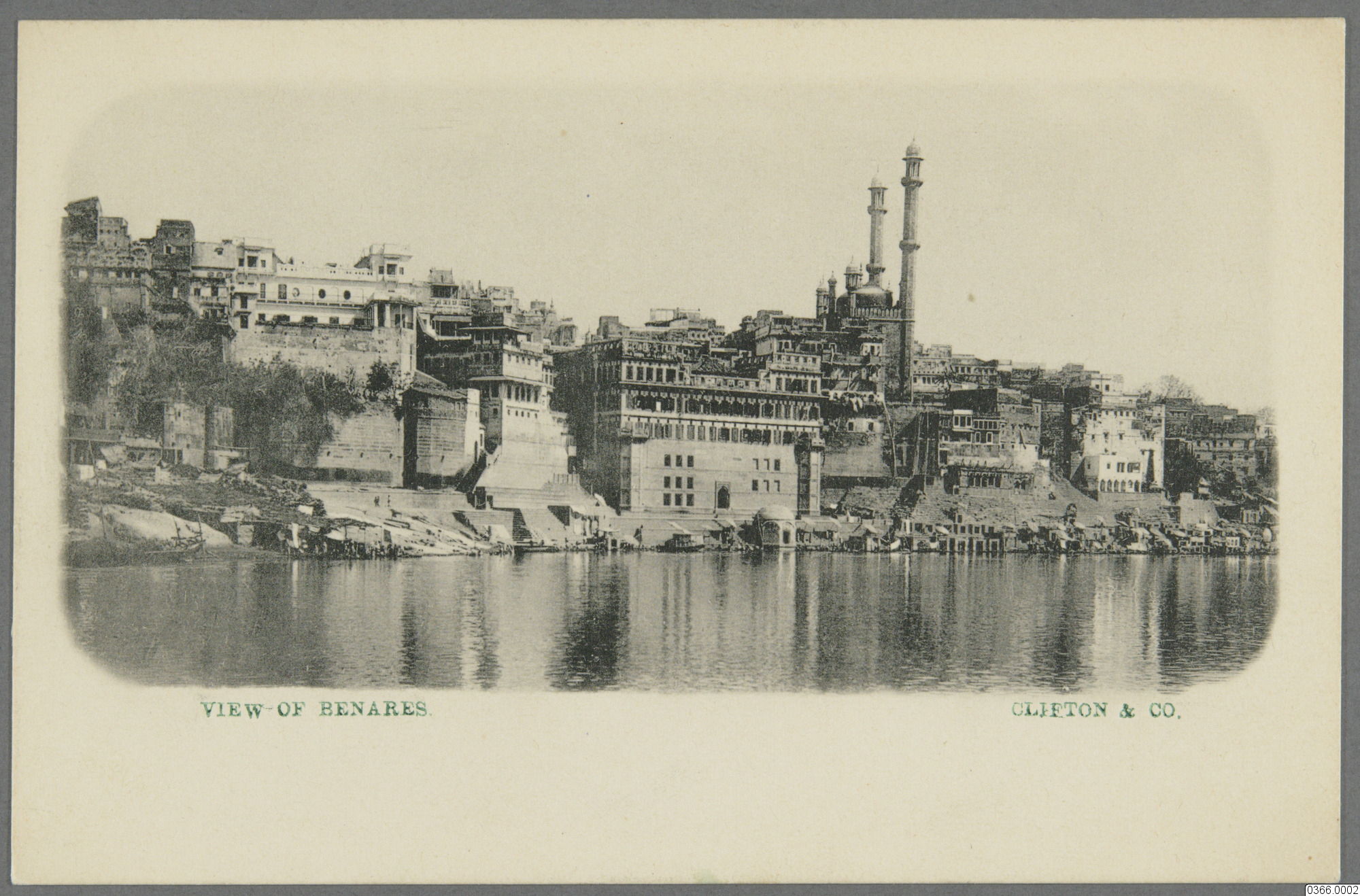 Vykort med motiv av tätbevuxen stad belägen precis invid vatten; Varanasi - uråldrig stad vid Gangesfloden, sägs vara Indiens äldsta bebodda stad och en av de heligaste. Uttar Pradesh, Indien. Text på framsida: "VIEW OF BENARES. CLIFTON & CO." Text på baksida: "POST CARD, THE ADDRESS TO BE WRITTEN ON THIS SIDE."