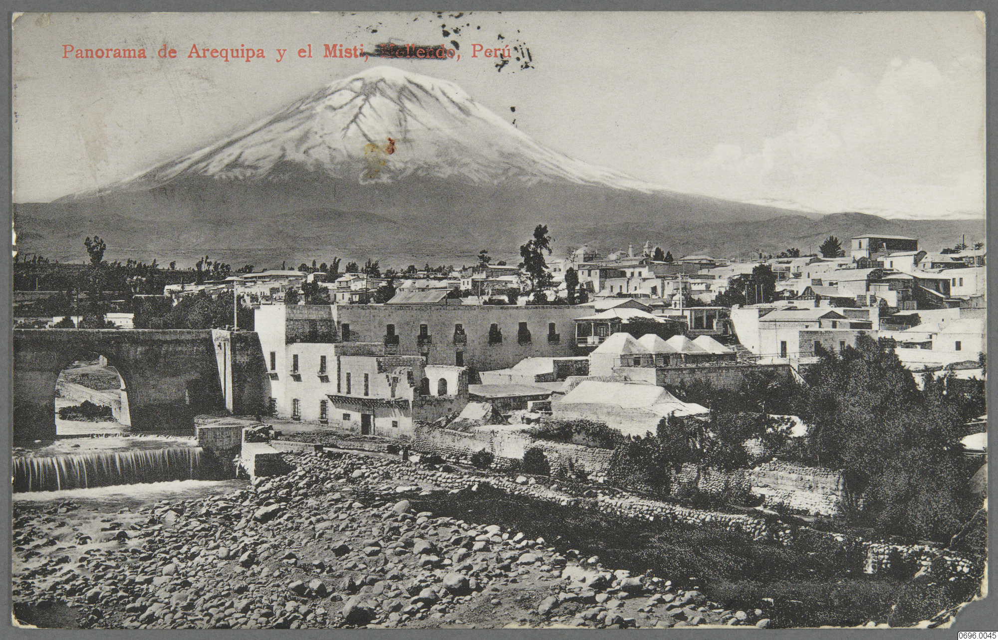 Vykort med motiv av stad nedanför vulkan, träd, växtlighet och träd i förgrunden, vatten som rinner under bro som leder in i staden. Panorama över staden Arequipa och vulkanen "Misti". Peru, Amerika. Text på framsida: "Panorama de Arequipa y el Misti, Mollendo, Peru." Text på baksida: "UNION POSTALE UNIVERSELLE, Tarjeta Postal - Carte Postale, Edicion propia de Max T. Vargas, Arequipa y La Paz. Printed in Germany, 188476, Arequipa Peru 7/10 1916, Kära Anna, Har varit här två dagar och oläsligt morgon upp till oläsligt dygn med ångbåt ofver Titicacasjön och oläsligt La Pa. Oläsligt därifrån hoppas allt väl oläsligt, Doktorinnan, Fru Anna Sandberg, Sturegatan 3 IV, Stockholm, Suecia, Europa."