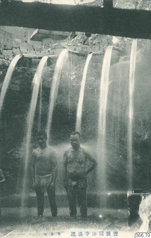 Vykort med motiv av två män i handdukar som duschar ståendes i sänka, vatten som rinner ner över bergkant genom fem rör, stort rör i förgrunden. Text på framsida: "Text på annat språk." Text på baksida: "POST CARD, CARTE POSTALE POSTKARTE, Text på annat språk."