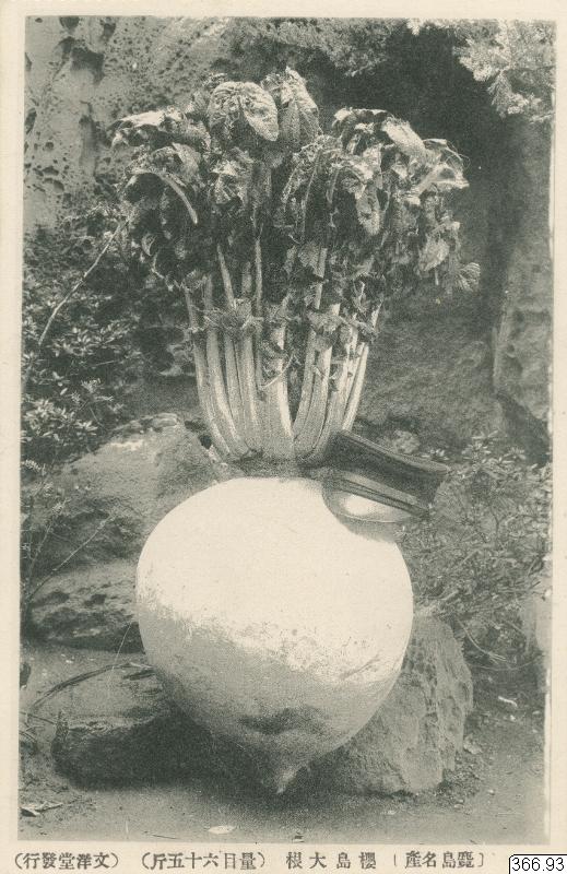 Vykort med motiv av gigantisk rova, hatt på rovan för storleksjämförelse, jord i bakgrunden. Text på framsida: "Text på annat språk." Text på baksida: "POST CARD, Text på annat språk."