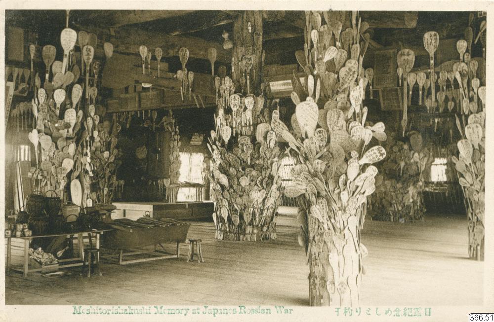 Vykort med motiv av minnesmärke från Rysk-Japanska kriget, 1904-1905, Japan. Text på framsida: "Meshitorishakushi Memory at Japanes Russian War, Text på annat språk." Text på baksida: "Carte Postale, text på annat språk."