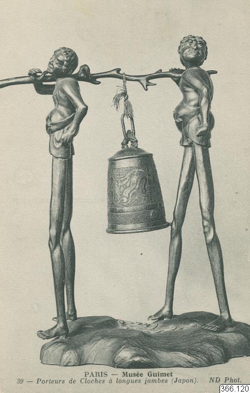 Vykort med motiv föreställande långbenta figurer som bär en klocka, med snirkligt motiv, på en gren mellan sig, plattform med kuperad terräng och mer snirkliga detaljer under dem. Figur från Japan. Text på framsida: "PARIS - Musée Guimet, 39 - Porteurs de Cloches à longues jambes (Japon.) ND. Phot." Text på baksida: "POST CARD, Carte Postale, POSTKARTE, BRIEFKAART - POSTKAART, CARTOLINA POSTALE, Text på annat språk, TARJETA POSTAL."