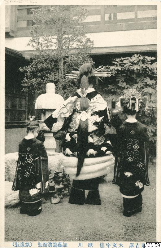 Vykort med porträtt av tre geishor, sett bakifrån, med avancerade håruppsättningar med flertalet håraccessoarer och praktfull klädsel, kvinnan i mitten har extra höga plattformar på sina Geta. Text på framsida: "Text på annat språk." Text på baksida: "Union Postale Universelle. CARTE POSTALE, Text på annat språk."