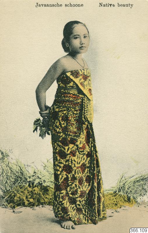 Vykort med kolorerat porträtt av kvinna, sett sentt framifrån, med uppsatt hår i knut, i gul och röd axellös långklänning, örhänge i det öra som syns, händerna på ryggen, håller i växter, barfota, växtlighet i bakgrunden. Javanesisk kvinna. Text på framsida: "Javaansche schoone, Native beauty."