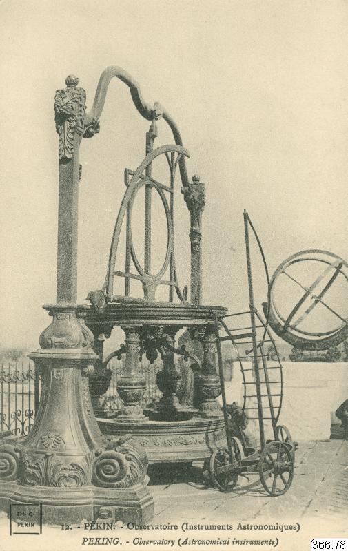 Vykort med motiv av flertalet instrument med dekorerad design. Astronomiinstrument i observatorium. Peking, Kina. Text på framsida: "H. C. PEKIN, 13. - PÉKIN. - Observatoire (Instruments Astronomiques) PEKING. - Observatory (Astronomical instruments)." Text på baksida: "CARTE POSTALE, CORRESPONDANCE, ADRESSE."