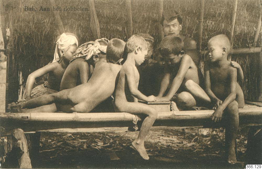Vykort med motiv av flertalet nakna barn, en halvnaken flicka i kjol och med huvudbonad, samt en vuxen mans huvud och axel i bakgrunden; barn sittandes på en ställning av trä ovanför marken spelandes tärning på en trälåda, vägg av strå och trästänger i bakgrunden. Bali, Indonesien. Text på framsida: "Bali, Aan het dobbelen." Text på baksida: "Briefkaart, text på annat språk, Adres, Kartoe pos. Alamat, Uitgave: J.M . Chs. Nijland, Societeistraat, Soerabaia."