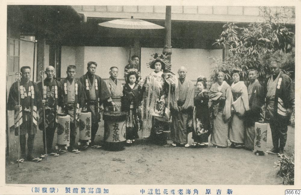 Vykort med porträtt av män och kvinnor uppradade på innergård, två män längst till vänster hållandes stavar, mannen i mitten hållandes parasoll över de två geishorna framför honom, andra män tycks hålla någon form av tunna med text framför sig. Text på framsida: "Text på annat språk." Text på baksida: "Union Postale Universelle. CARTE POSTALE, Text på annat språk."