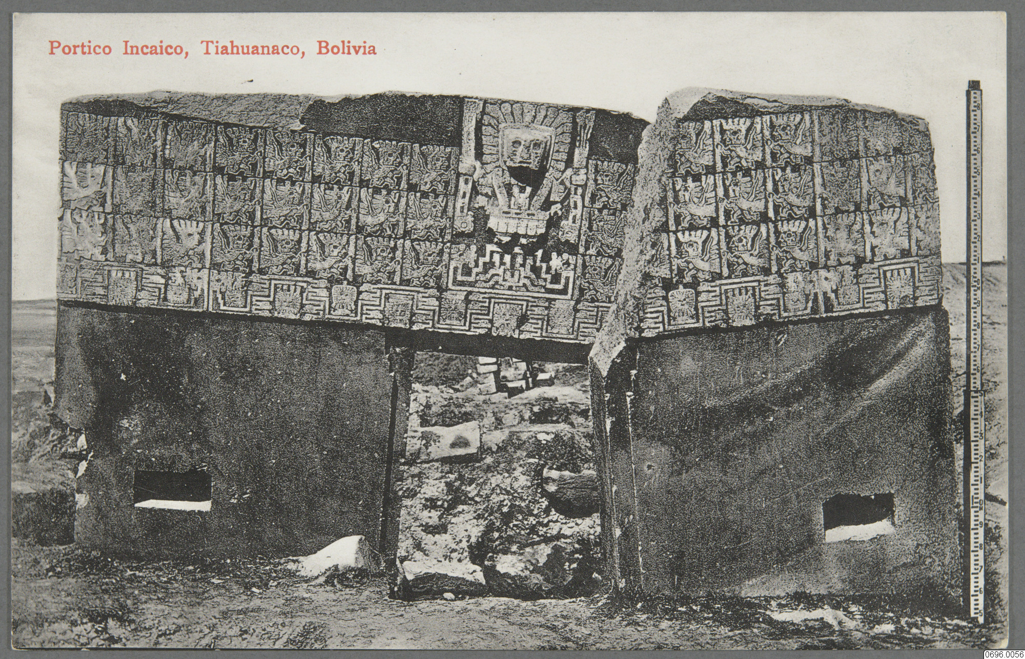 Vykort med motiv av stenport med inristade fiugrer och mönster i övre delen av porten, mätsticka upprest till höger om den. Inkaport härstammande från Inkariket. Tiwanako, Bolivia, Amerika. Text på framsida: "Portica Incaico, Tiahuanaco, Bolivia" Text på baksida: "UNION POSTALE UNIVERSELLE, Tarjeta Postal - Carte Postale, Edicion propia de Max. T. Vargas, Arequipa y La Paz, Printed in Germany. 188487."