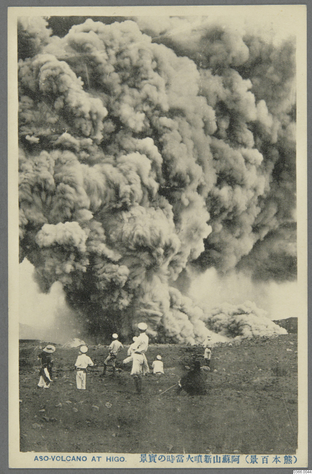 Vykort med motiv av kraftigt rökmoln som kommer upp framför beskådande människor, vulkanutbrott. Vulkanen Aso i Kumamoto, Kyushu, Japan. Text på framsida: "ASO VOLCANO AT HIGO, Text på annat språk." Text på baksida: "CARTE POSTALE, Text på annat språk, Vulkanutbrott på Aso-san i Syd-Japan."