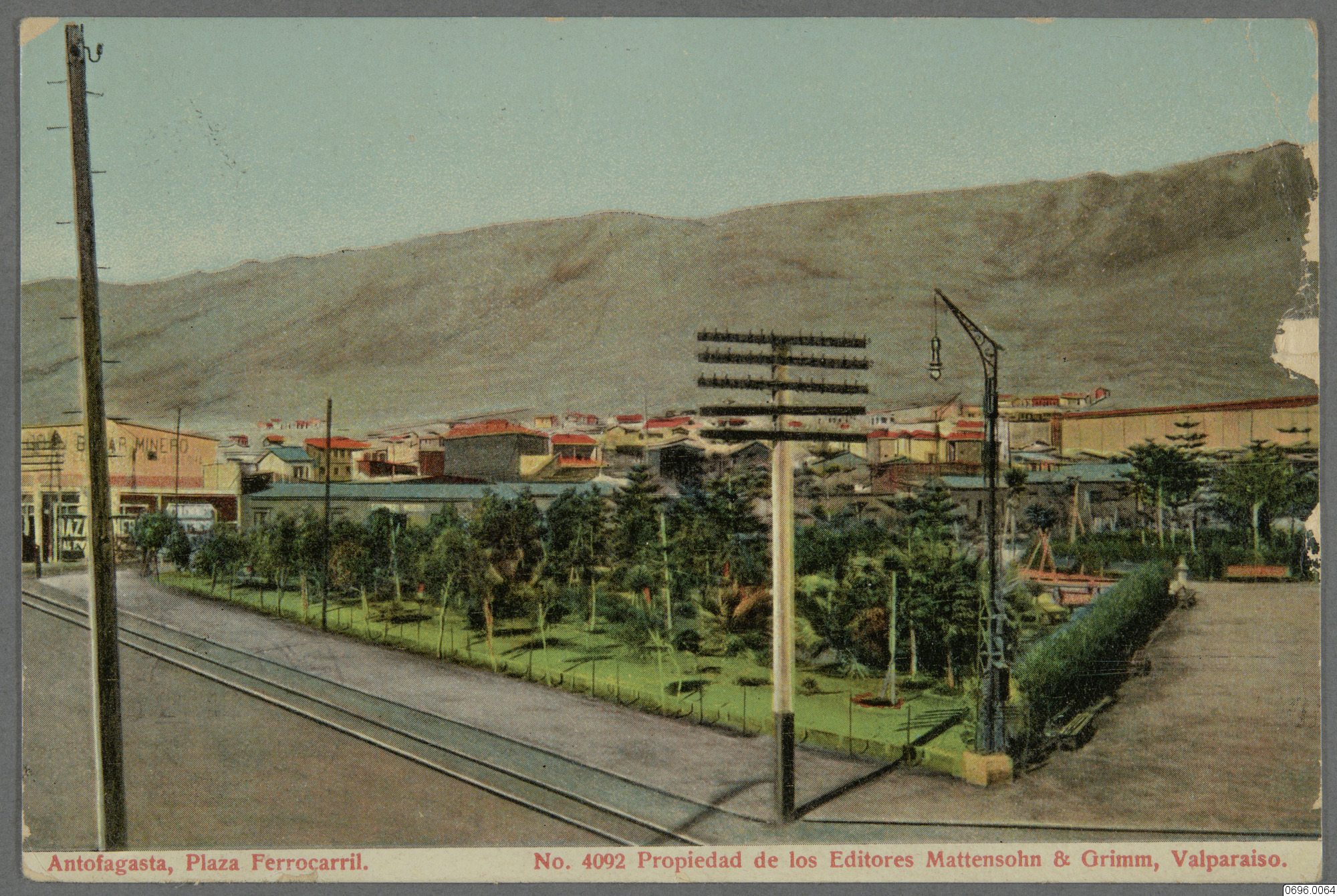 Vykort med kolorerad bild av torg sett från sidan, ledningsstoplar i förgrunden, trottoar, staket som ramar in plats med växtlighet, hus i bakgrunden samt berg. Text på framsida: "Antofagasta, Plaza Ferrocarril. No. 4092 Propiedad de los Editores Mattensohn & Grimm, Valparaiso." Text på baksida: "(Communicaciones) Antofagasta 19/10 1916, Anlände idag morse. Kommer att afrresa för San Francisco före den 24 eller 25, då oläsligt är försenad. Reser i oläsligt upp till oläsligt och är antagligen oläsligt 22 oläsligt om oläsligt. Allt väl. Hjärtliga hälsningar till dig och alla, oläsligt Wilhelm, Tarjeta Postal (Solo para la Direccion) Doktorinnan, Fru Anna Sandberg, Sturegatan 3 IV, Stockhol, Suecia, Europa."
