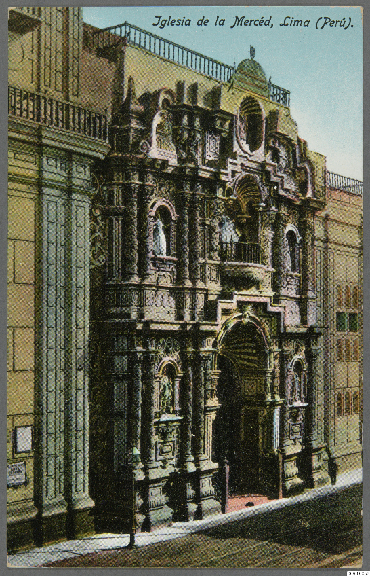 Vykort med kolorerad bild av framsida på religiös byggnad, detaljrik front med inbyggda figurer med egna balkonger, kolonner samt räcken. Port till religiös byggnad, baroque stil. Lima, Peru, Amerika. Text på framsida: "Iglesia de la Mercéd, Lima (Perú). Text på baksida: "Tarjeta postal, Correspondencia, Dirección, STGE, M. N. Benavides, Lima (Perú). No. 9, SR..."