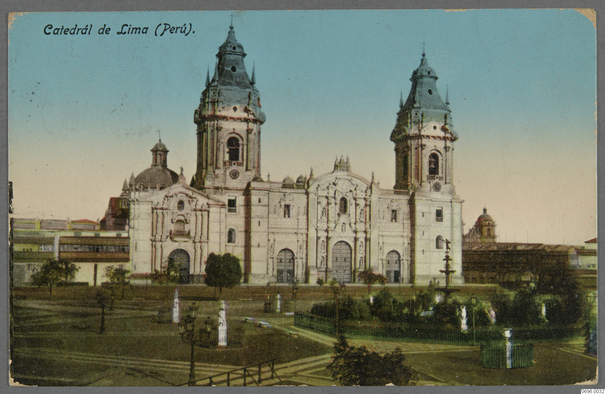 Vykort med kolorerad bild av ståtlig katedral i vitt med blått tak på tornen, park framför byggnaden med fontäner och grönska. Lima-katedralen; huvudkyrka i Peru, Amerika. Text på framsida: "Catedrál de Lima (Perú)." Text på baksida: "Tarjeta postal, Correspondencia, Dirección, M.N. Benavides, Lima (Perú). No.10, Lima 29/8 1916, Käraste Anna, lämnar idag Lima efter Juja (?) oläsligt men återvänder hit efter ett par veckor. Oläsligt bref allt hade anlänt här, men postgången är mycket bersvärlig nu och jag tappar ofta bref, då jag återvänder hit. Oläsligt, Doktorinnan, Fru Anna Sandberg, Sturegatan 3, Stockholm, Suecia, Europa."