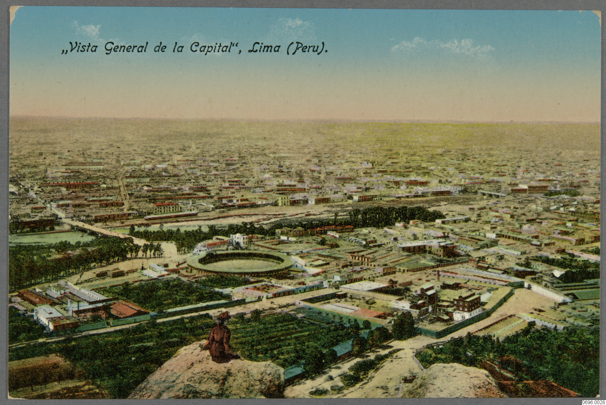 Vykort med kolorerad bild av människa sittandes på kant av berg med stad som brer ut sig nedranför, många byggnader, åkrar samt vatten syns, ett runt stadium ganska centralt i bild. Vy över staden Lima, huvudstad i Peru. Amerika. Text på framsida: "Vista General de la Capital, Lima (Peru)." Text på baksida: "Tarjeta postal, Correspondencia, Dirección, SUON, Luis Sablich, Calle de la Constitucion No. 1033 Callao (Perú) S. A, Sr..."