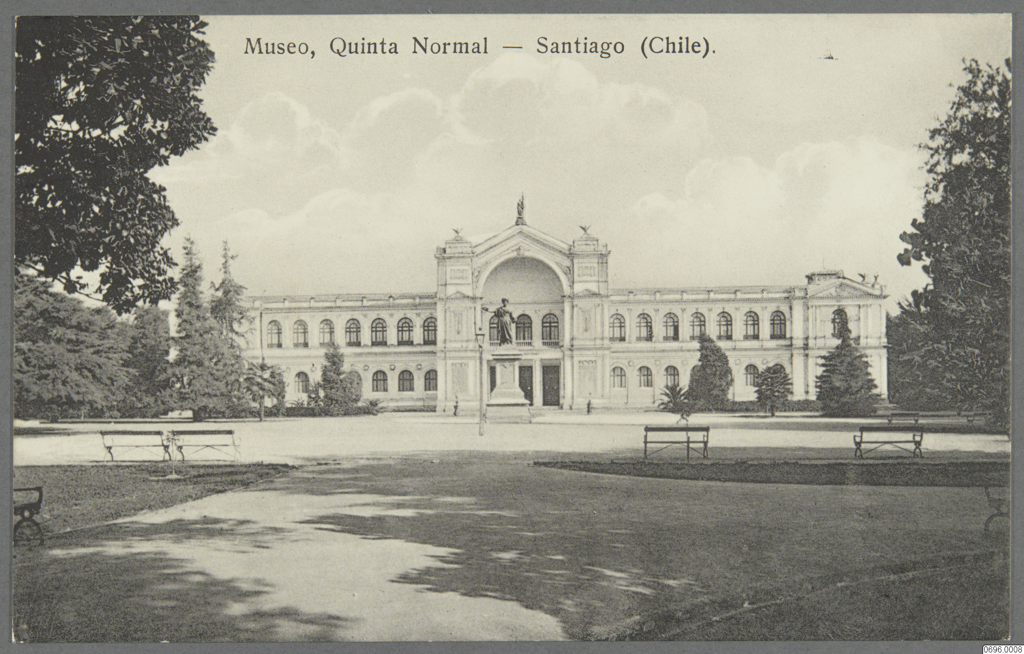 Vykort med motiv av avlång byggnad med många rader fönster, med gård i förgrunden med bänkar och gräsplättar, staty av människa, träd på sidorna samt stora fluffiga moln bakom byggnaden. Museum Quinta Normal. Santiago, Chile, Amerika. Text på framsida: "Museo, Quinta Normal - Santiago (Chile)." Text på baksida: "(Comunicaciones) Tarjeta Postal (Solo para la Direccion) Propriedad de Hume y Ca, Ahumada 357."