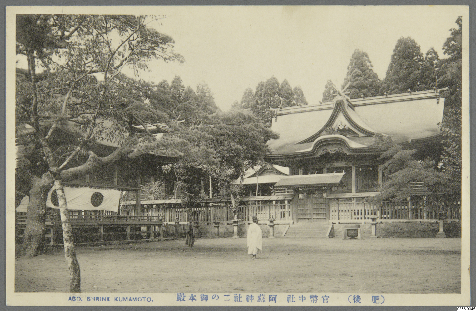 Vykort med motiv av byggnad i bakgrunden, människa på gård som leder upp till byggnaden, byggnad till vänster, träd omger byggnaderna, banderoll med figur hängandes till vänster. Jinja Helgedomen Aso - svårt skadad i jordbävningarna i Kumamoto 2016. Kumamoto, Japan. Text på framsida: "ASO. SHRINE KUMAMOTO, Text på annat språk." Text på baksida: "CARTE POSTALE, Text på annat språk, Lila blomformad stämpel med text."
